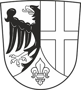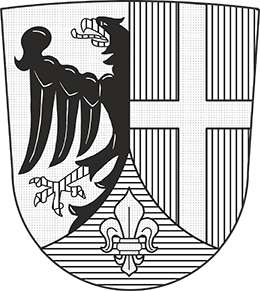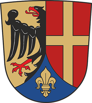 "Über einer gekürzten und eingeschweiften blauen Spitze, darin eine heraldische Lilie, gespalten von Gold und Rot; vorne ein halber rot bewehrter schwarzer Adler am Spalt; hinten ein durchgehendes goldenes Kreuz" |